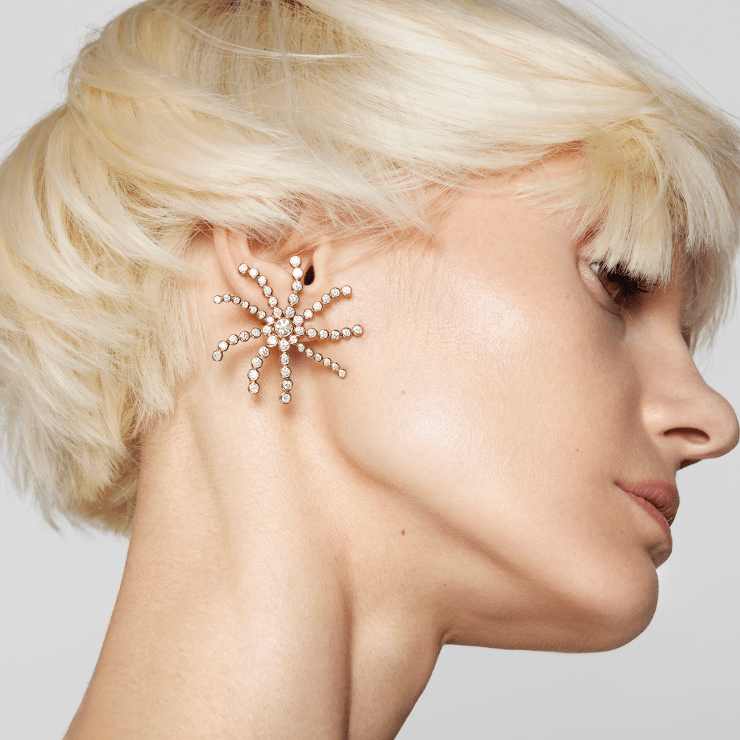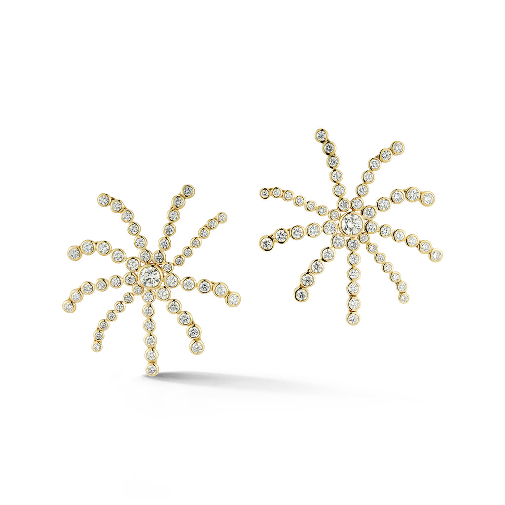 A dazzling burst of bezel-set diamonds envelops the ear in radiant brilliance, making the Big Bang Earring a true statement piece. Designed with an Omega clip closure for a secure and comfortable fit, each pointed end is articulated, introducing unexpected movement that enhances the play of light. Bold yet refined, these statement earrings bring dynamic elegance to any fine jewelry collection.