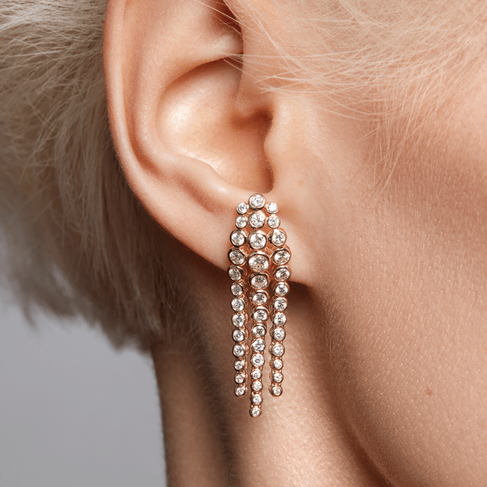 Designed for effortless elegance, the Small Illumine Earring features three rows of bezel-set diamonds that gracefully embrace the full lobe. Cascading into articulated diamond fringe, these earrings move fluidly with every motion, creating a mesmerizing display of light and brilliance. A refined take on the chandelier earring, this statement piece adds sophistication and radiance to any fine jewelry collection.